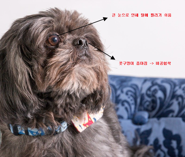 시츄는 납작한 코와 큰 눈을 갖고 있다. 하지만 이 큰 눈은 털이 눈을 찌르기 쉬우므로 안구에 상처가 나기 쉽다. 자주 털에 눈을 찔리다 보면 안구 자체에서 눈물이 잘 고이지 않아 안구가 건조해질 수 있다. 안구가 건조해지면 염증이 생길 위험이 커지게 된다. 시츄를 기를 때 털을 짧게 해서 길러야 좋은 이유가 이런 이유 때문도 있다. 또한 시츄의 납작한 코로 인해서 단두종 증후군이 걸리기 쉽다. 호흡기 쪽의 문제인데 콧구멍이 좁아지는 비공 협착이 대표적이다. 콧구멍이 좁아지며 호흡하기가 힘들어지는데, 여기서 증상이 더 심해지면 콧구멍이 막히면서 입안에 압력이 생긴다. 그렇게 되면 이 압력 때문에 입안에 연구개가 늘어나면서 연구개 노장이라는 질환까지 생기게 될 수 있다.